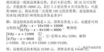 本題有兩個未知數,即商品本錢和預售總價,也有兩個明顯的等量關系,即兩種打折出售的獲利情況,根據售價-成本-存貨費用=利潤,可以列出方程組求解即可。