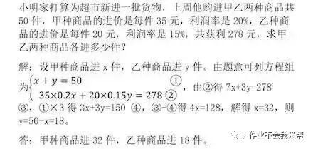 本題易知第一個等量關系為甲乙兩種商品共50件,則有x+y=50。根據甲乙商品的進價和利潤率可知甲商品每件利潤為35×0.2=7元,乙商品每件利潤為20×0.15=3元,再由所獲總利潤得到第二個等量關系,組成方程組求解即可。